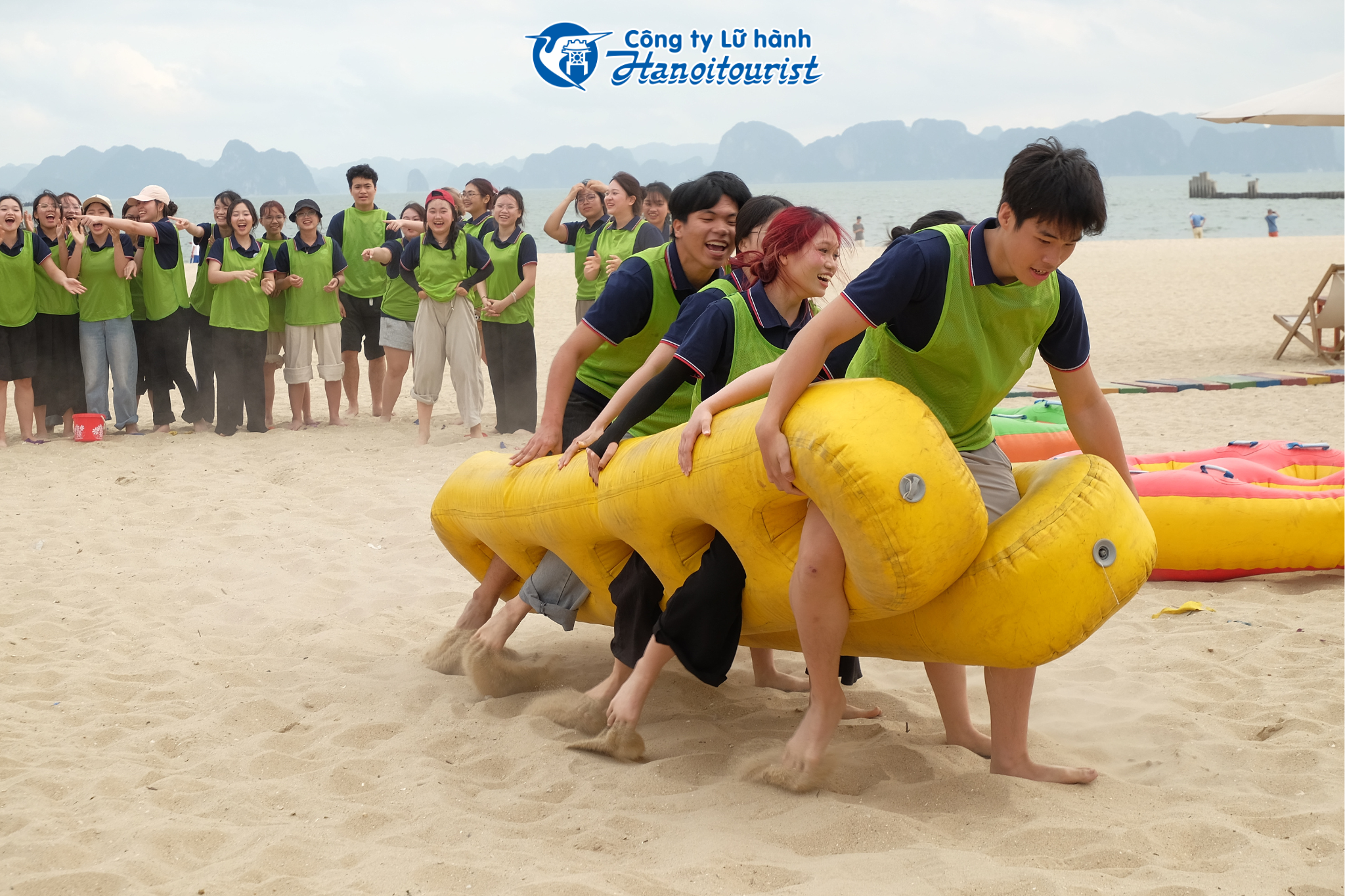 Điểm nhấn bùng nổ của hành trình trải nghiệm thực tế chính là những giờ phút Team Building đầy nhiệt huyết trên bờ cát trắng mịn. Giữa tiếng sóng vỗ và nắng vàng Hạ Long, mọi khoảng cách dường như bị xóa nhòa.