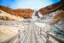 🐧 Thung lũng địa ngục Jigokudani Noboribetsu: Quý khách dạo bước giữa các hồ nước nóng dọc theo con đường lát ván gỗ, đầy tuyết phủ trắng xóa và cảm nhận hơi ấm trên làn da của bạn.